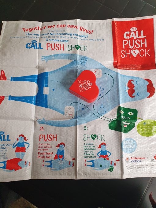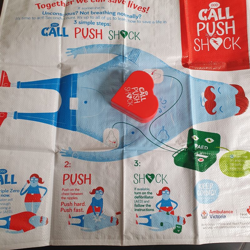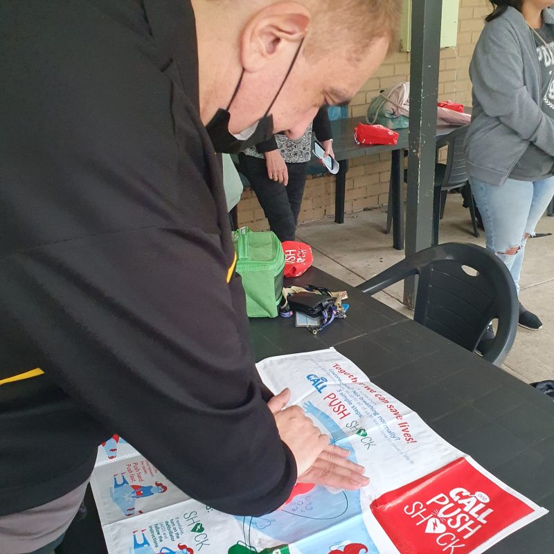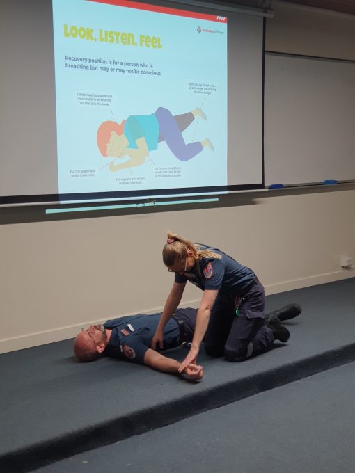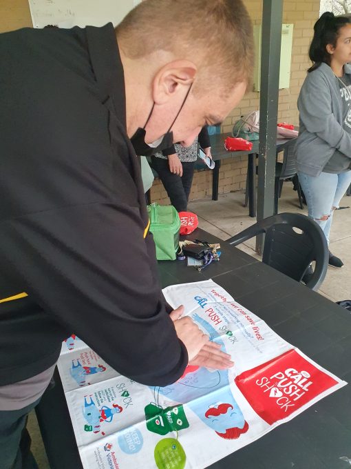 Justyna and Sean demonstrated the recovery position, played an example of a 000 call and went through the steps people can take to make their house easier for paramedics to find in an emergency. Participants then learned the signs of heat exhaustion and heat stroke and were given a goodie bag with equipment to help them perform CPR.