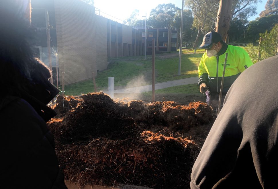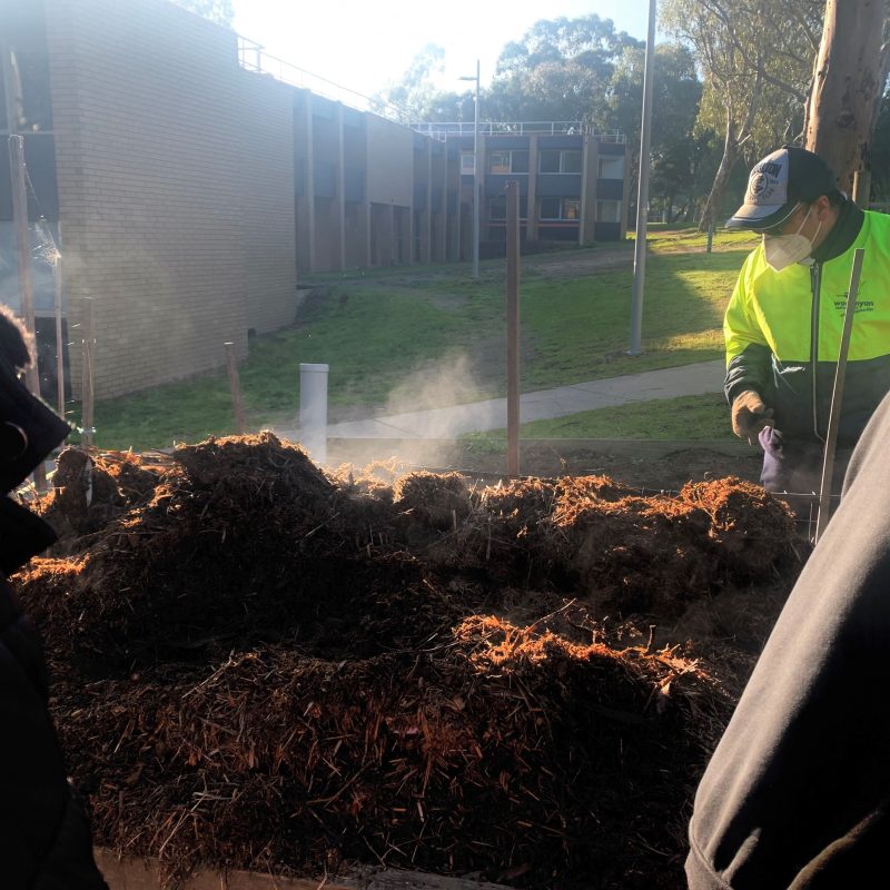 Participants have established a green manure crop that is growing thick and strong – a lush green highlight in the veggie patch. Alongside this, we have an enormous manure hot pile, established with endless bags of horse manure, straw and paper (an initially stinky task). These cold mornings have provided a wonderful opportunity to witness the heat and steam of the pile as we turn it over and keep it cooking! It’s a wonderful moment of the week putting cold hands onto the toasty warm pile and lifting it to watch the steam rise like a hot oven!
