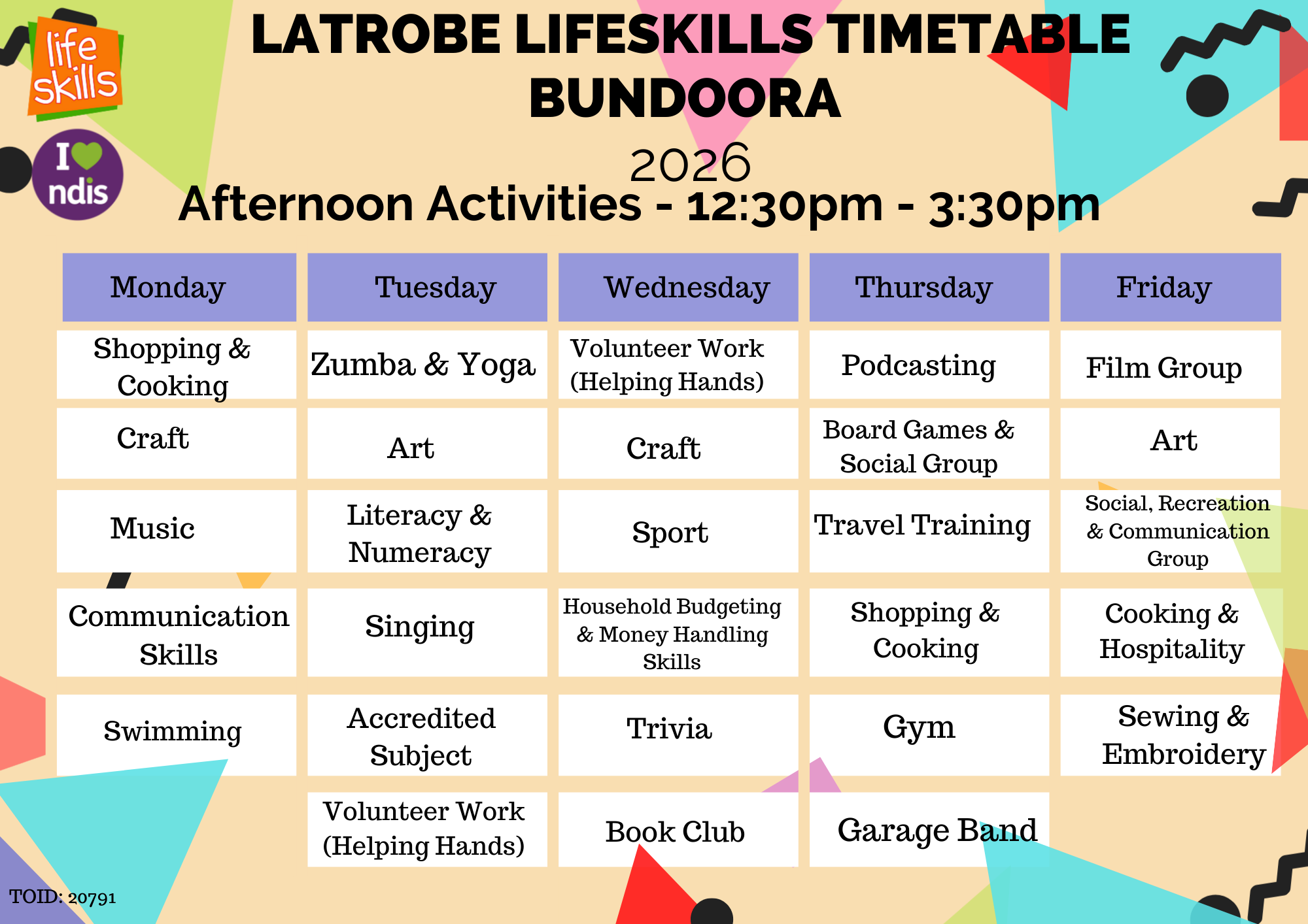 Timetable Check out our current Bundoora and Bendigo timetables for 2026! Bundoora Timetable Bendigo Timetable Please note that activities are subject to availability. To check for the availability of activities, please email info@lifeskills.vic.edu.au or call 03 9479 1474.